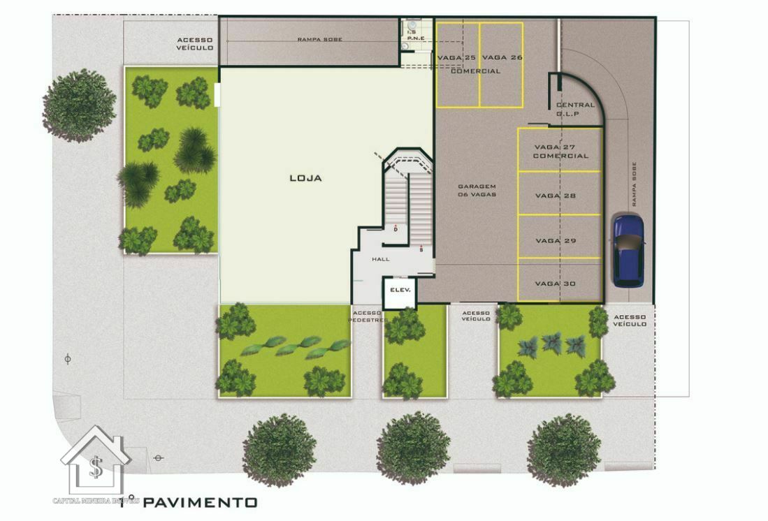 1º pavimento: loja, hall social, garagem com 06 vagas, acesso de veículos ao subsolo (24 vagas) e ao 2º pavimento;
