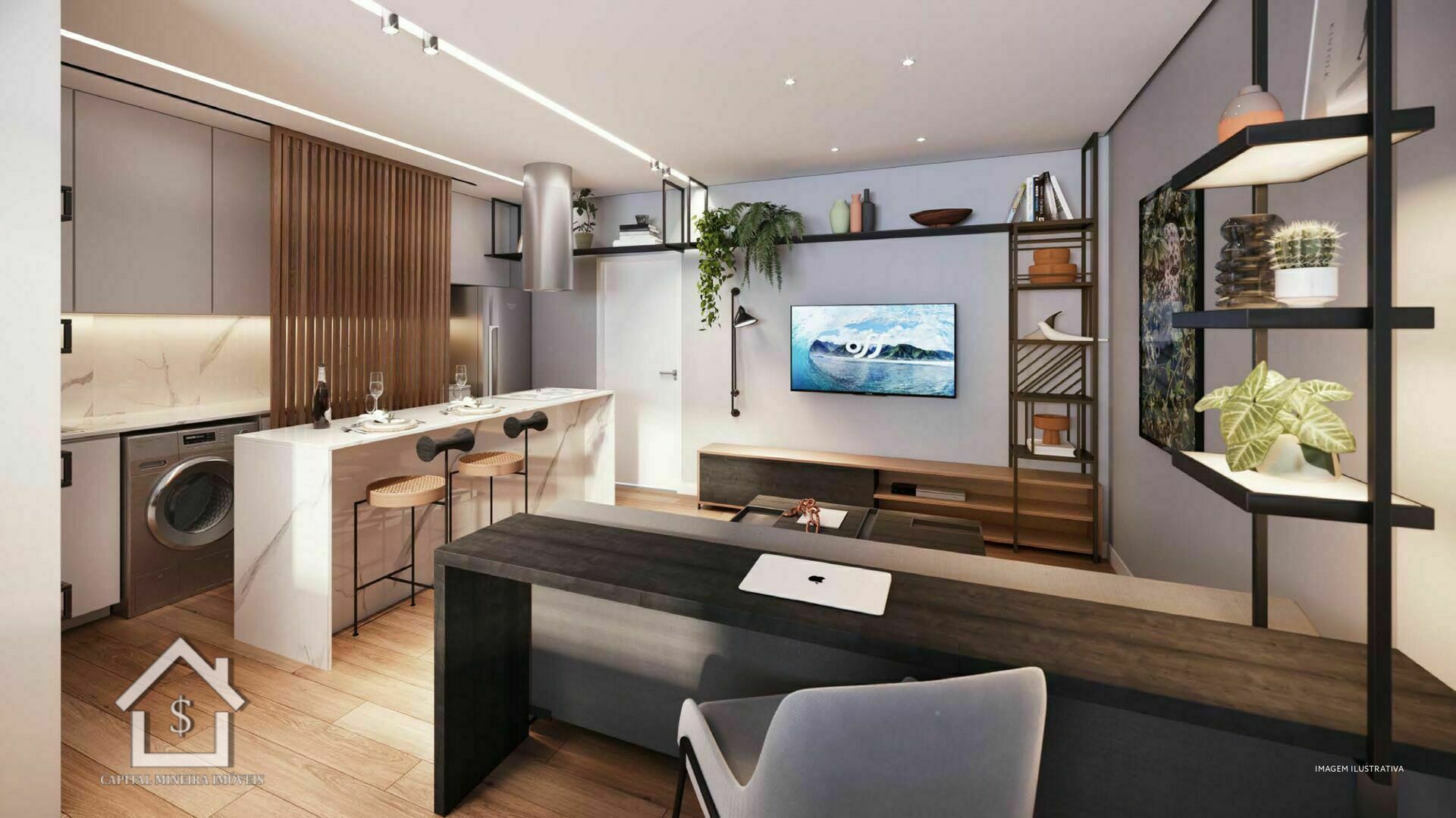 Cobertura duplex com 1 quarto de 77 m² a 89 m². Os ambientes são integrados, sala e quarto com piso vinílico, banheiro com piso em porcelanato e bancada em granito, na cozinha americana com previsão elétrica para cooktop. No segundo nível temos um hall, banheiro e terraço com área de serviço.