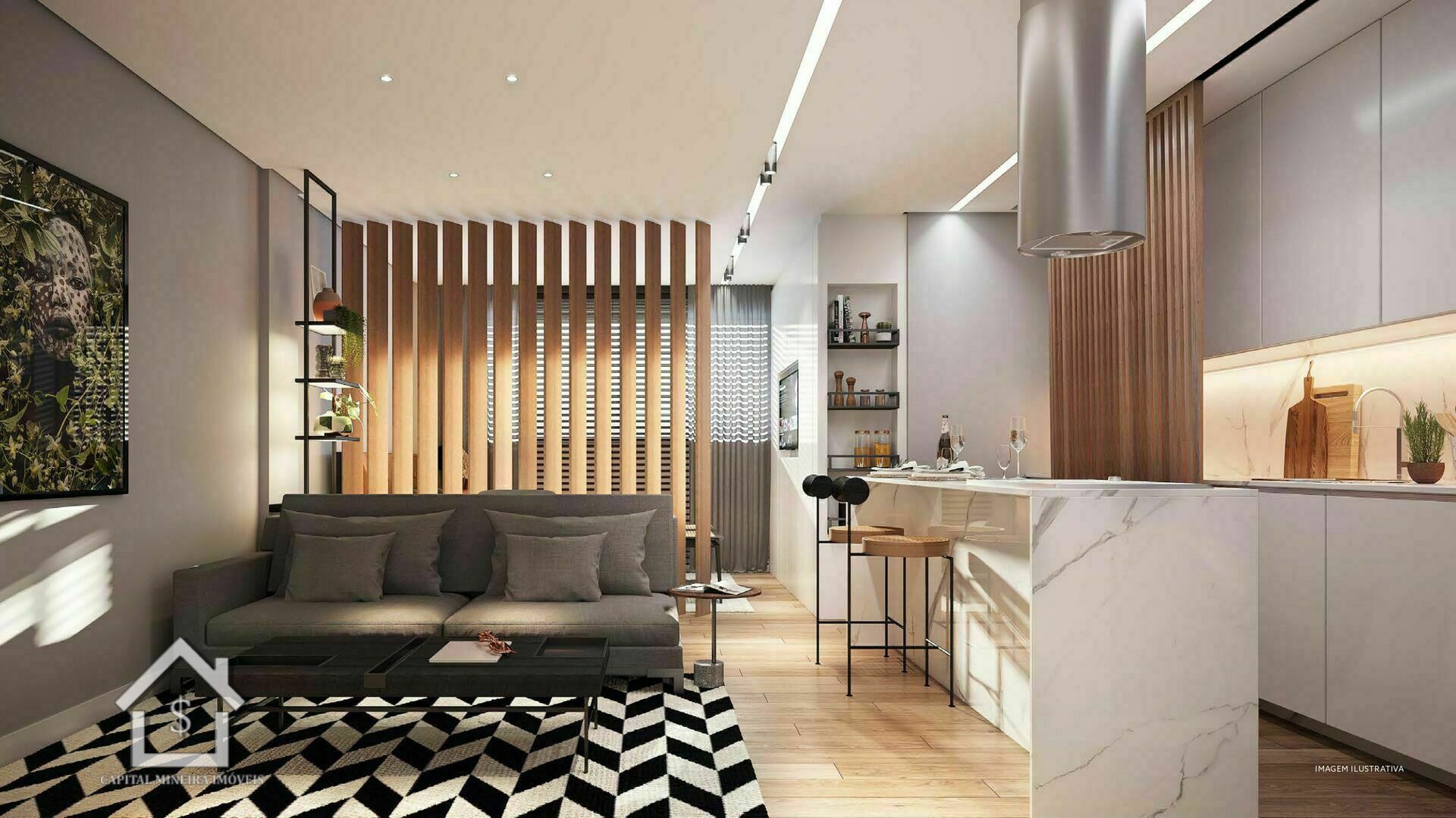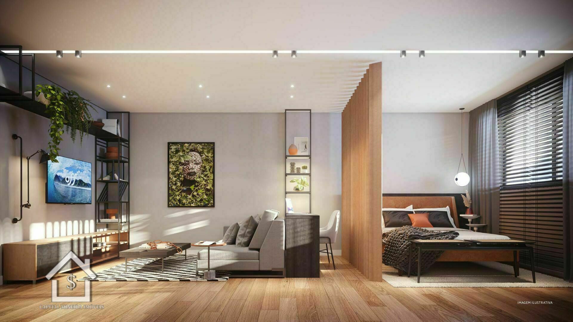 Cobertura duplex com 1 quarto de 77 m² a 89 m². Os ambientes são integrados, sala e quarto com piso vinílico, banheiro com piso em porcelanato e bancada em granito, na cozinha americana com previsão elétrica para cooktop. No segundo nível temos um hall, banheiro e terraço com área de serviço.