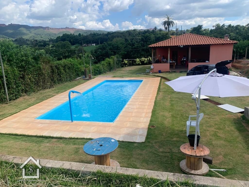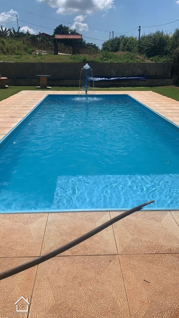 Sitio com terreno de 2.162 m² a casa com 3 quartos, sendo 1 suíte, 2 banheiros, sala, cozinha, sinuca e área gourmet com churrasqueira. Piscina de 60.000 L com deck.